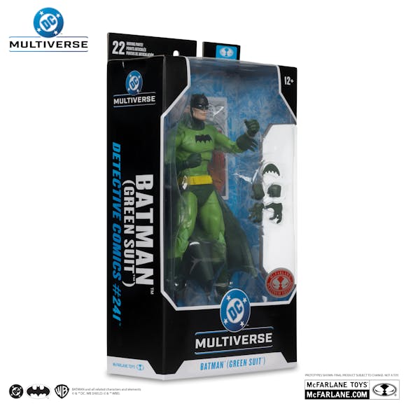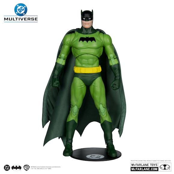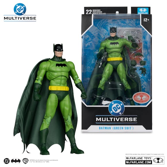 Batman (Green Suit) is a 7" figure with extra hands & a batarang all featued in a green finish.