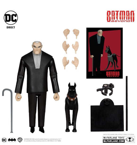 A new Dark Knight, trained by none other than a retired Bruce Wayne, protects a futuristic Gotham of the 21st century. Incredibly detailed 6” scale figure based on the legendary tv series BATMAN BEYOND™. Accessories include cane, 6 extra hands, Ace the hound, display stand and collectible art card.