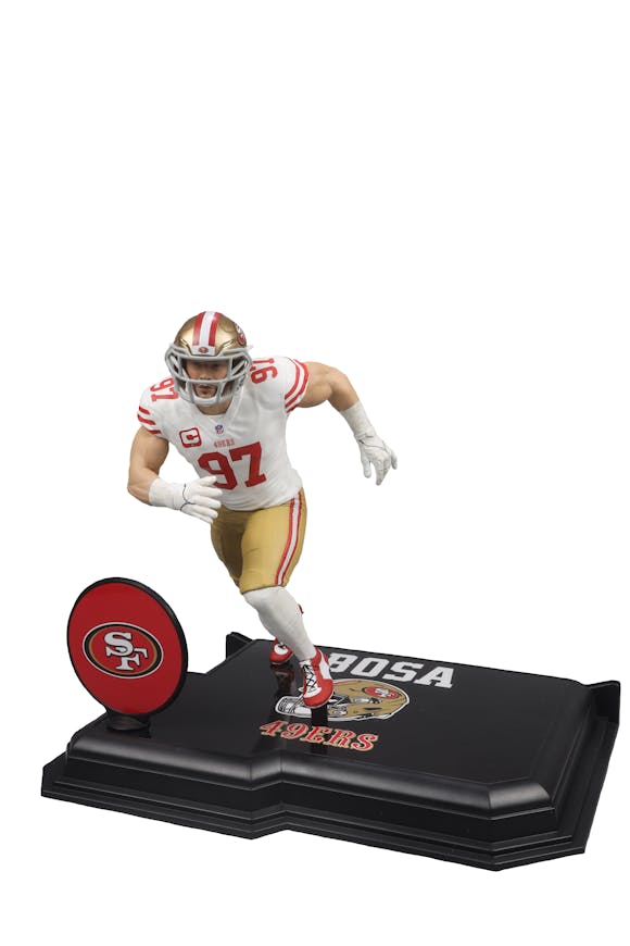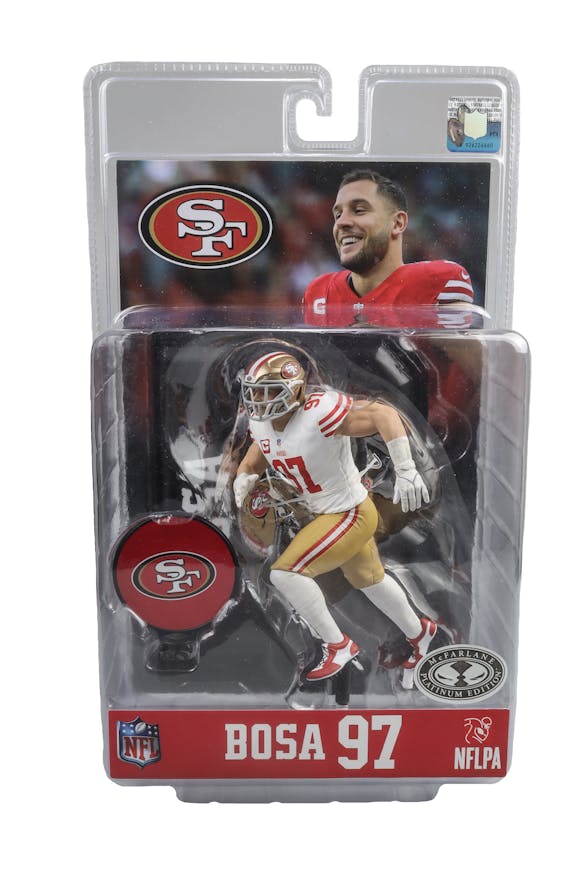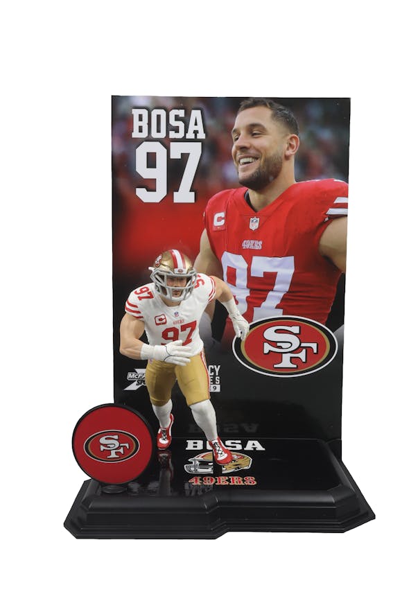 McFarlane's SportsPicks NFL Legacy Series Figure #9. Nick Bosa was selected second overall by the 49ers in the 2019 NFL Draft. He was named NFL Defensive Rookie of the Year and helped the team reach Super Bowl LIV. In 2022, Bosa won the NFL Defensive Player of the Year award and was named to his third Pro-Bowl team.