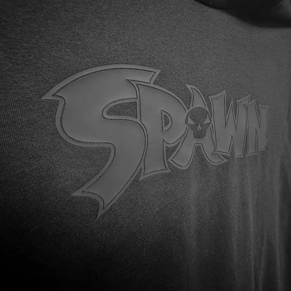 Todd McFarlane designed shirt features a custom 3D silicone matte black Spawn Logo on Front; and McFarlane Toys "It's An Attitude" logo on back.