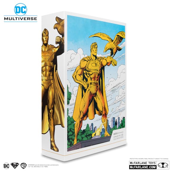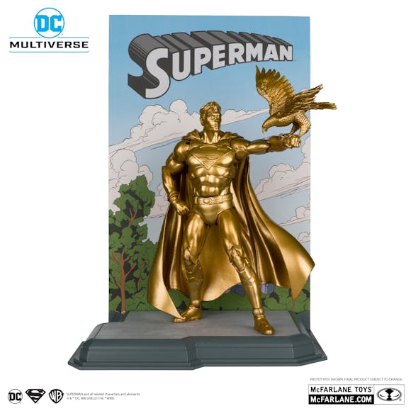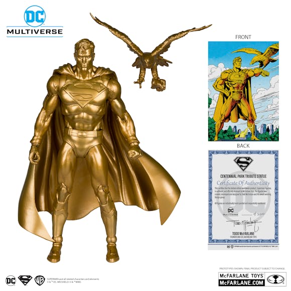 Superman 7" Scale Articulated Figure is featured in gold deco based on the Centennial Park Tribute Statue comic. Accessories include eagle, display base with backdrop, and certificate of authenticity.