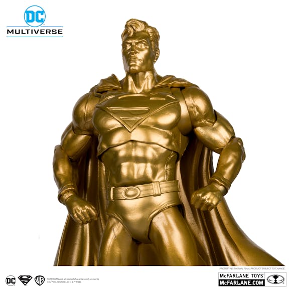 Superman 7" Scale Articulated Figure is featured in gold deco based on the Centennial Park Tribute Statue comic. Accessories include eagle, display base with backdrop, and certificate of authenticity.